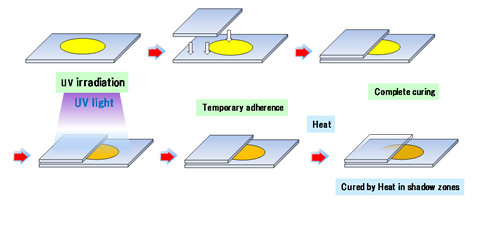 紫外線+加熱混合型環氧膠水、藉由紫外線的照射先預固定,之後藉由加熱固定使紫外線無法照射的陰影部分也可以產生硬化。
